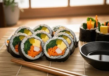 Kimbap is a popular Korean dish made with rice, vegetables, and different fillings, all rolled in seaweed. It is similar to sushi, but the flavor is different because Korean rice